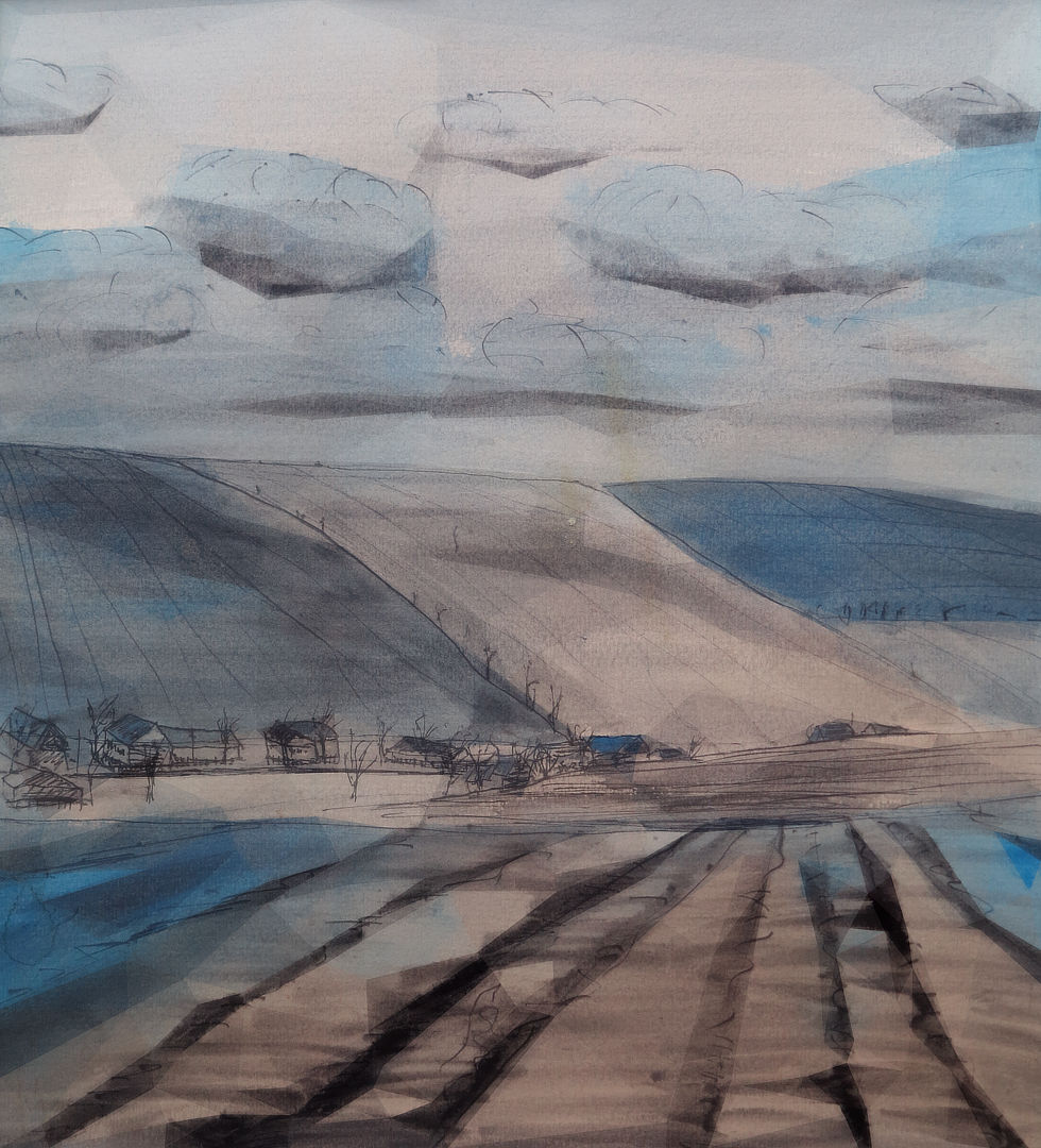 ⊙ Landschaften 1980er Aquarellkarton Bäume Ebenen Felder Freude Frische Himmel Hügel Kälte Land Regen schwarz Sturm Tageszeit Täler türkis Tusche Wasserfarbe Wolken Zeichnung